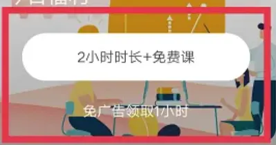 每天打开软件可免费领取阅读时长,选择 “ 2 小时时长+免费课 ” ,点击后会有一个课程销售界面弹出,关闭后书桌界面的今日剩余免费时长会变为 120 分钟;选择 “ 免广告领取 1 小时 ” 则没有广告页面跳出,时长为 60 分钟。